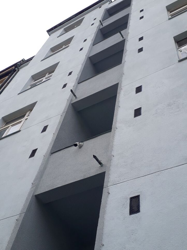 Celková oprava fasády v Holešovicích, včetně demontáže starého a instalace nového stožáru uprostřed fasády.