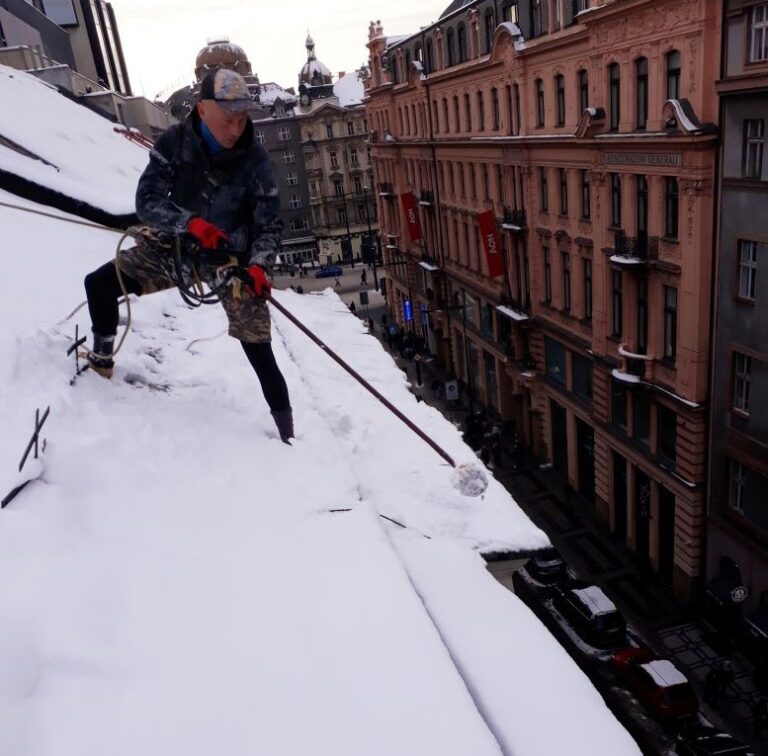 Odklízení sněhu ze střechy hlavní Pošty v centru Prahy